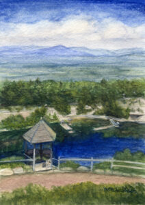Summerhouse over Lake Mohonk, watercolor, 7 x 5″, Sold